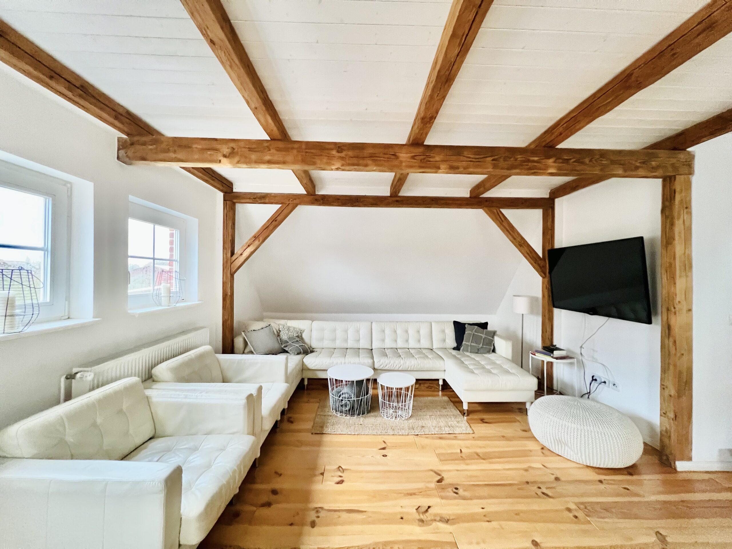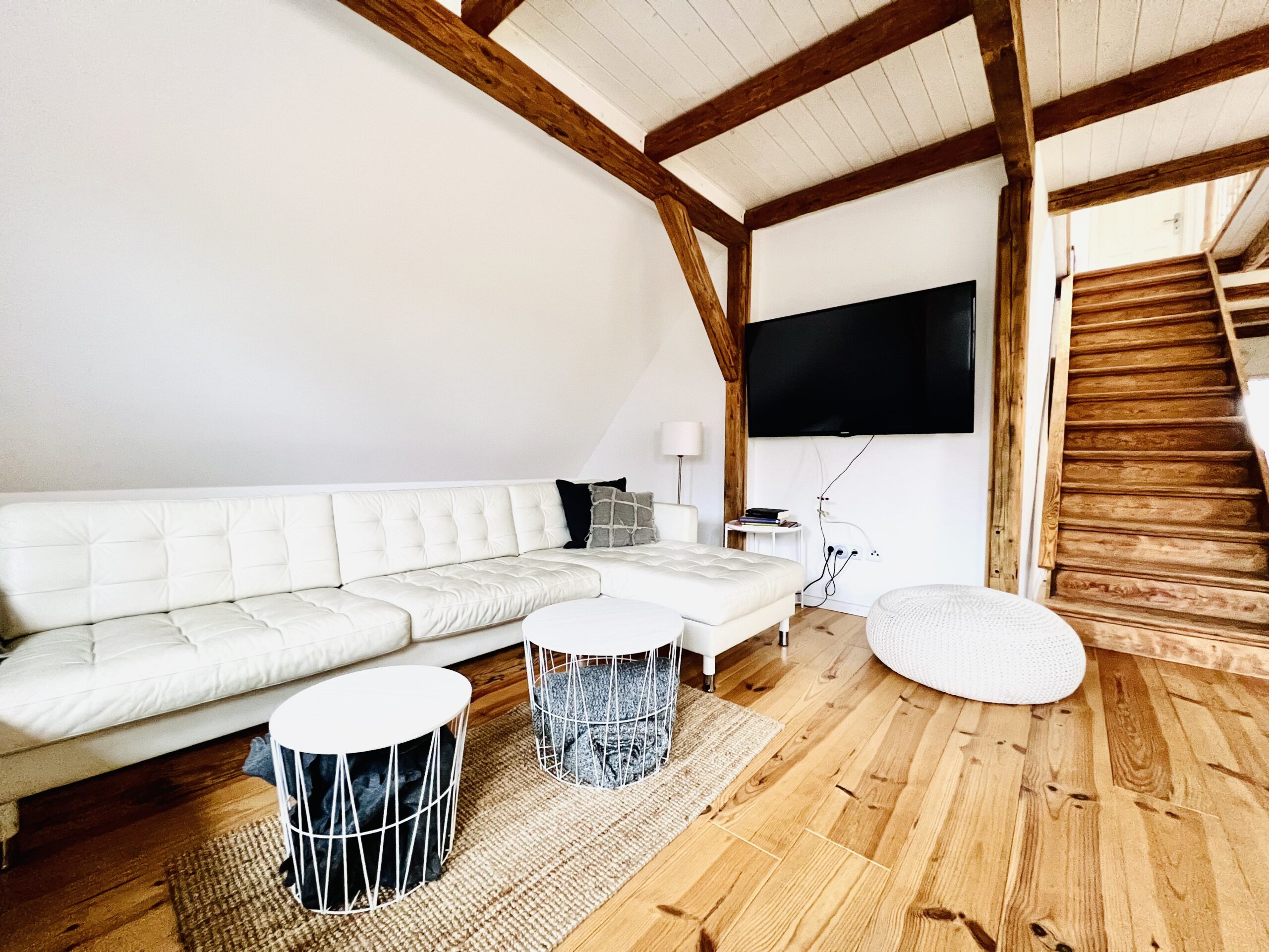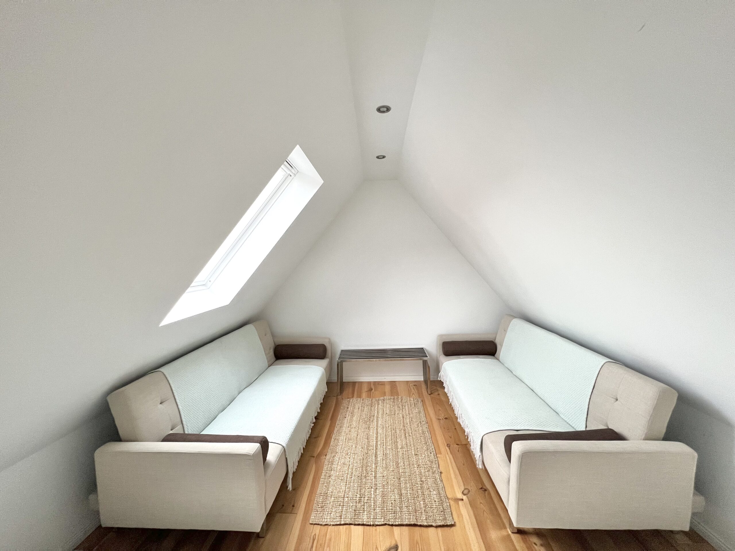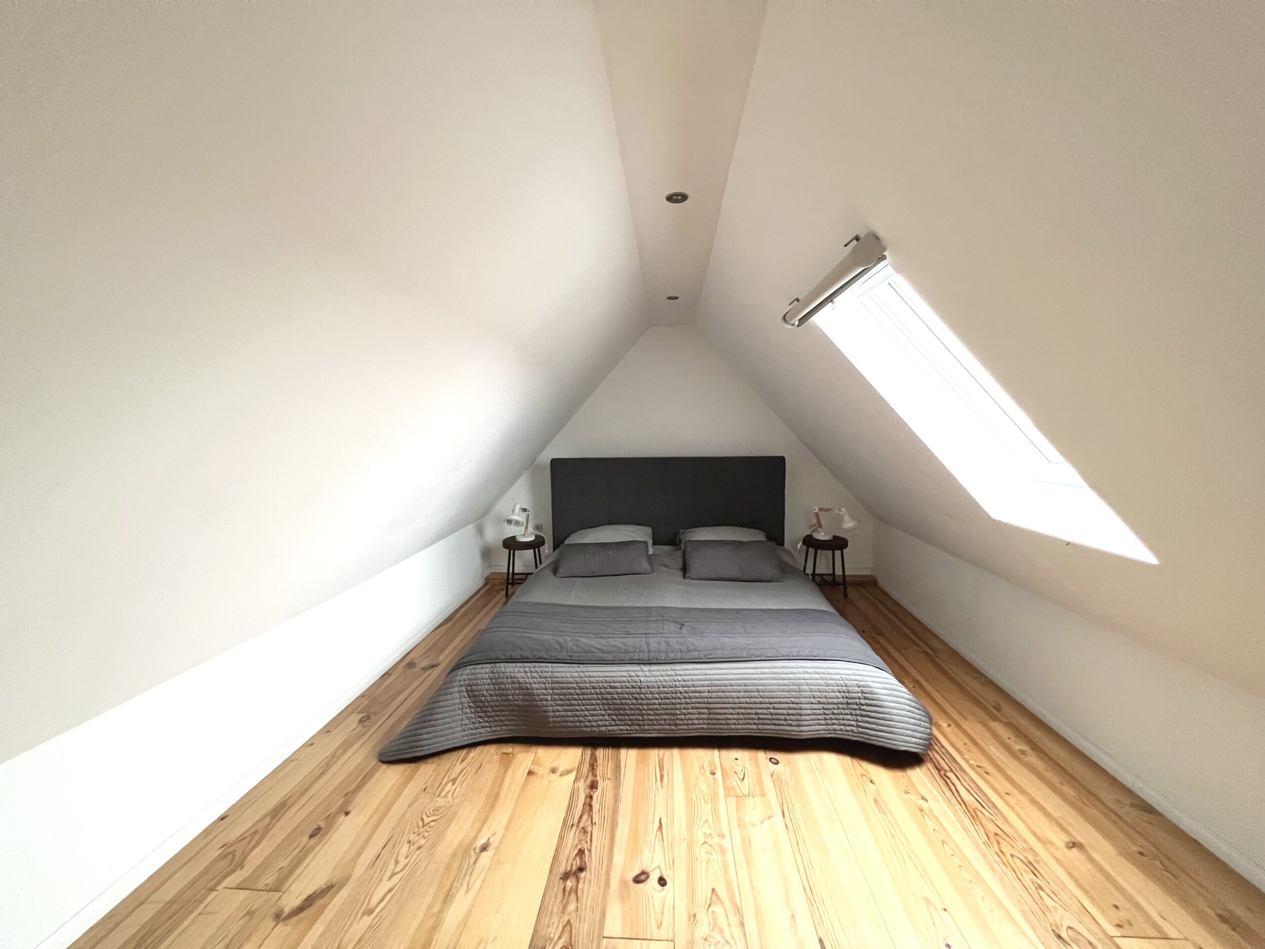Im Dachgeschoss der Wohnung befinden sich zwei weitere Schlafzimmer mit Doppelbett (180×200) sowie ein offener Ruhebereich mit zwei ausklappbaren Sofas.
