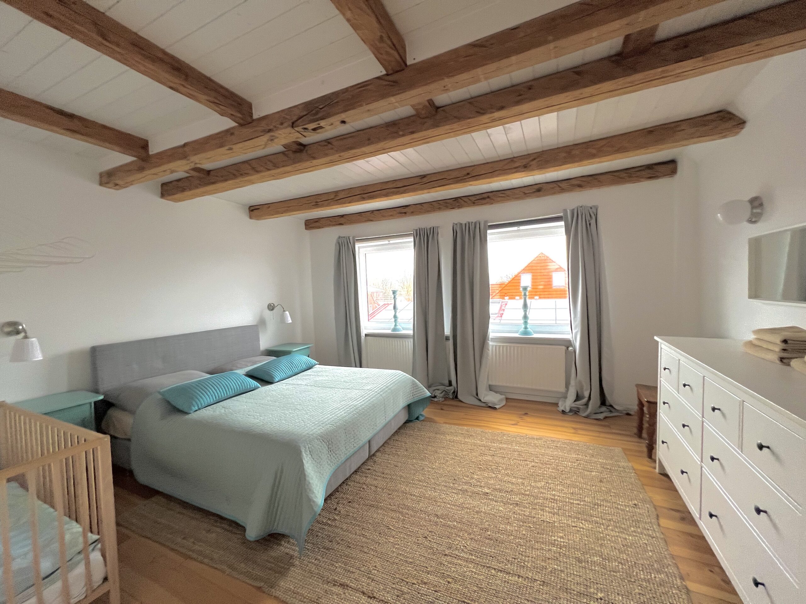 Im unteren Geschoss der Wohnung befinden sich zudem noch zwei Schlafzimmer. Ein Schlafzimmer verfügt über eine Doppelbett (140×200) und ein Babybett.
