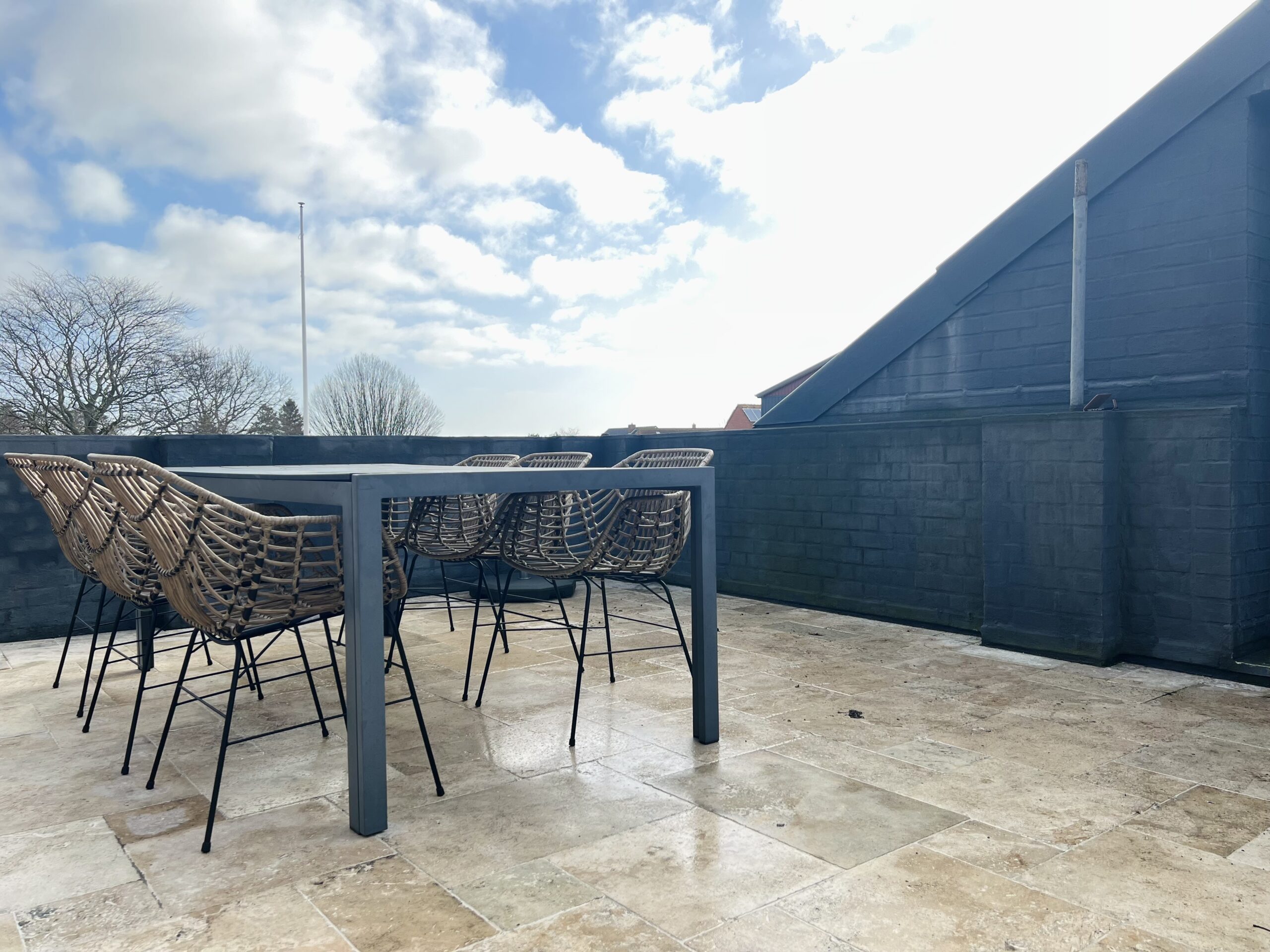 Die Wohnung verfügt über eine Dachterrasse die gemeinsam beiden Ferienwohnungen des Hauses zur Verfügung steht. Die Dachterrasse teilt sich in zwei Bereiche auf, sodass jede Unterkunft ihren eigenen Bereich hat.