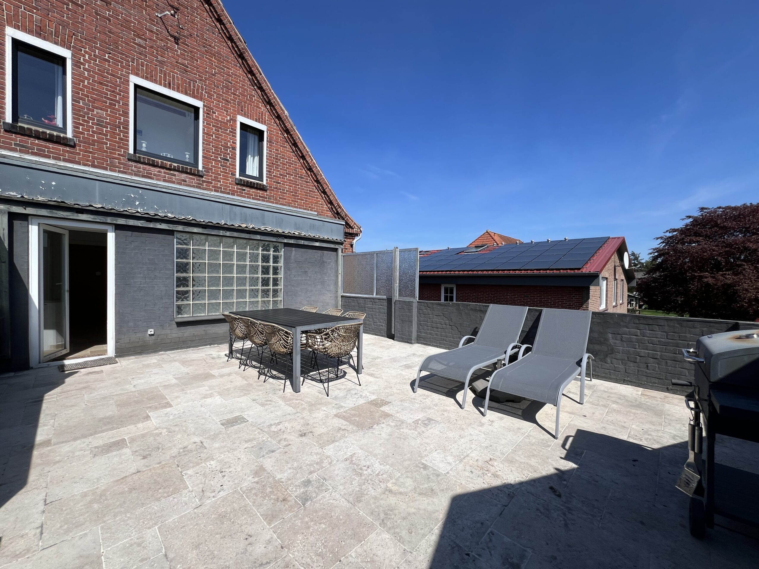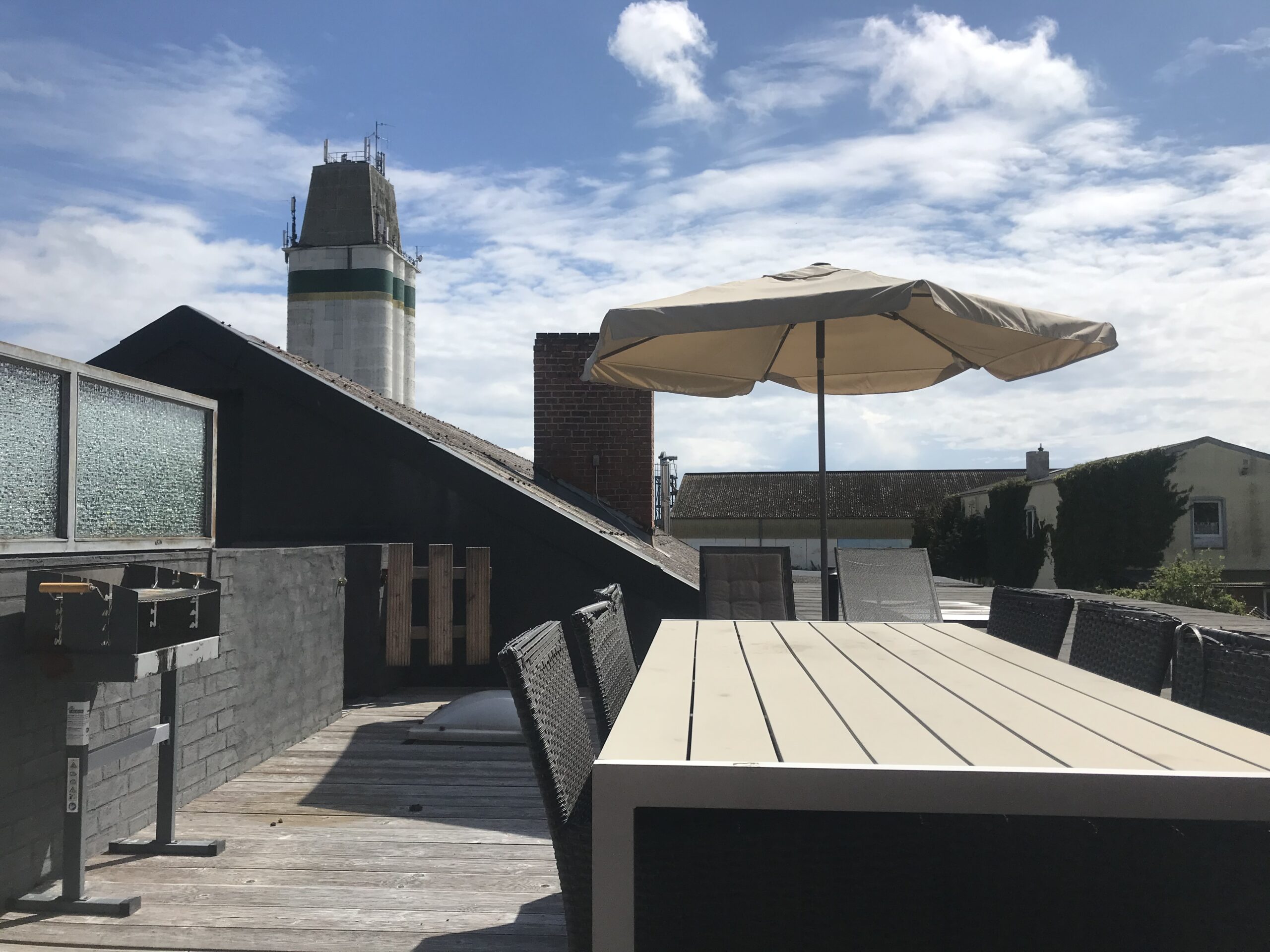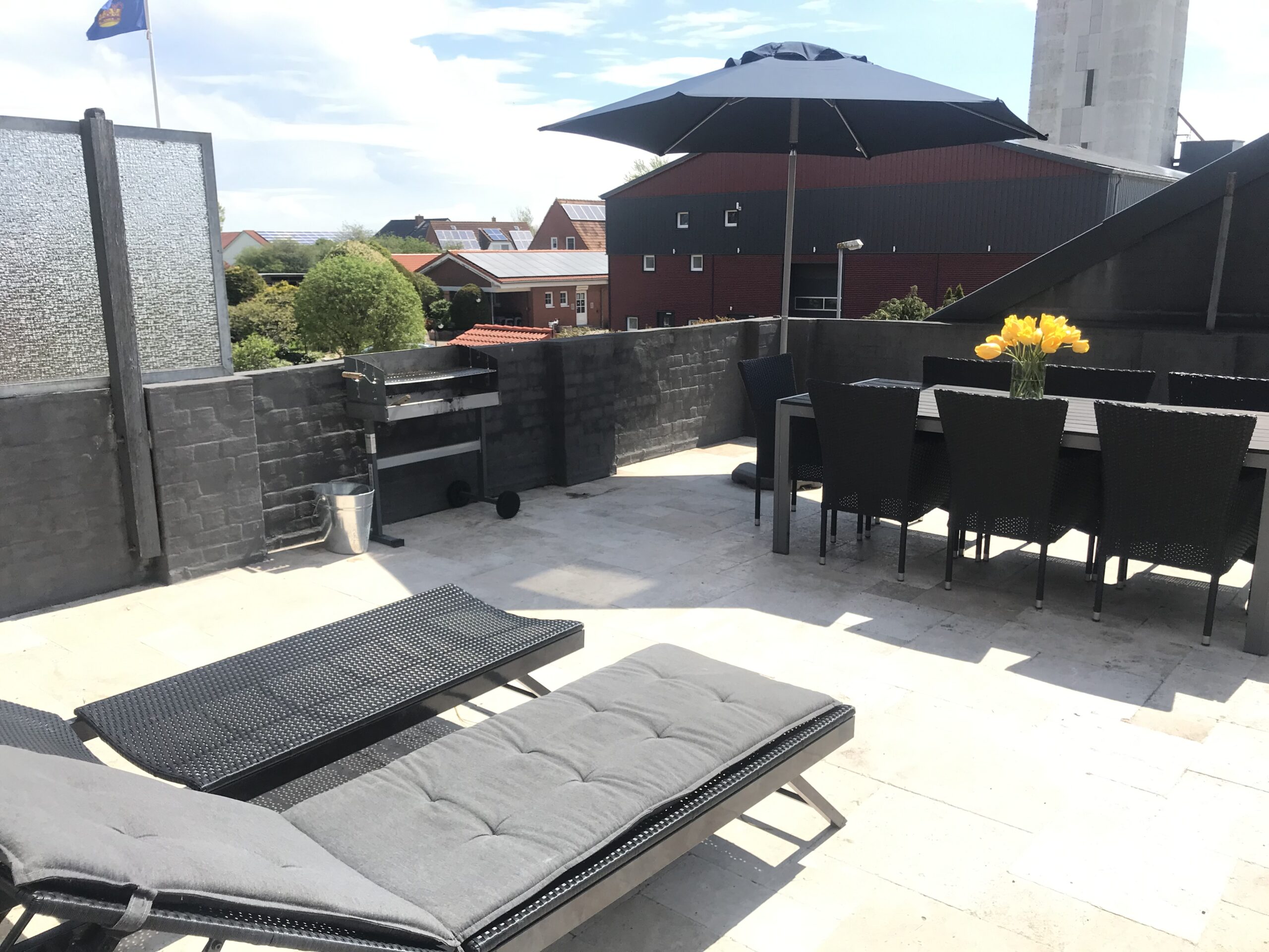 Jeder Bereich der Dachterrasse verfügt über Sitzmöglichkeiten für bis zu 8 Personen, sowie jeweils zwei Sonnenliegen. Zudem ist die Dachterrasse mit jeweils einem Holzkohlengrill ausgestattet.
