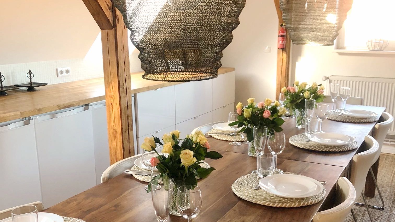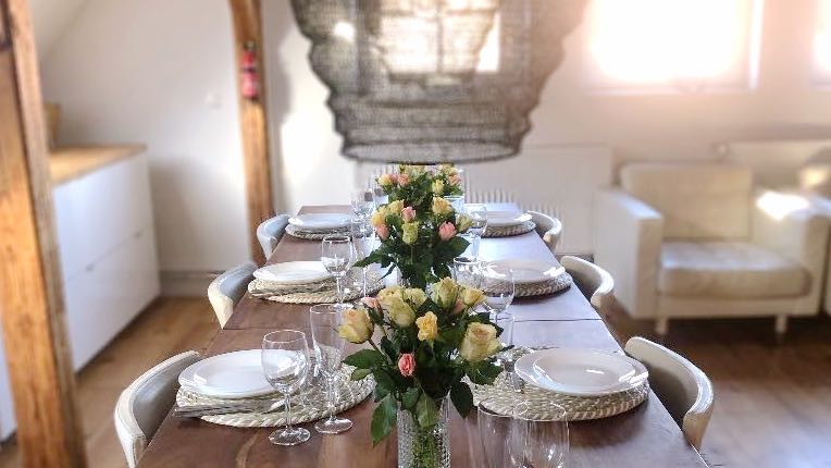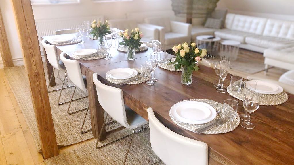Die Wohnung Bel Vue bietet auf 200 m² Platz für bis zu 6 Personen und erstreckt sich über zwei Etagen. Im unteren Geschoss lädt ein großer Wohn-Essbereich mit einer 8 m langen Küchenzeile und einem großen Esstisch zu geselligen Abenden ein. Eine gemütliche Sitzecke mit TV rundet den Wohnbereich ab.