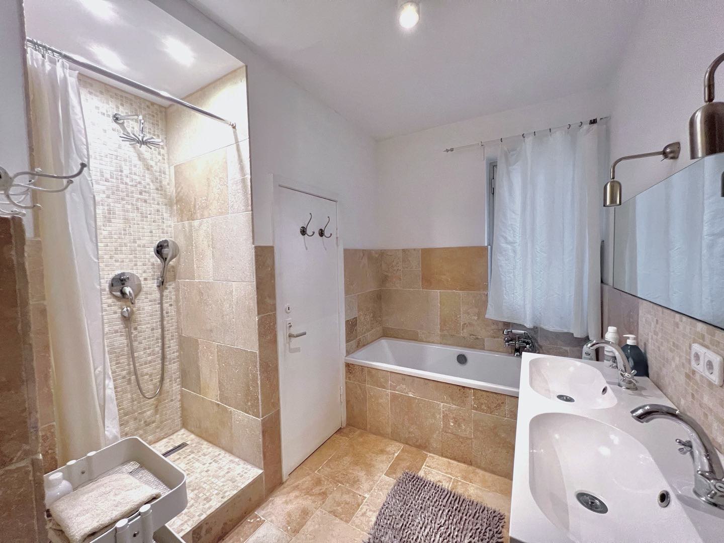 Zwei Bäder: eins mit freistehender Badewanne, Doppelwaschbecken und WC; das zweite mit Dusche, Waschbecken und WC.