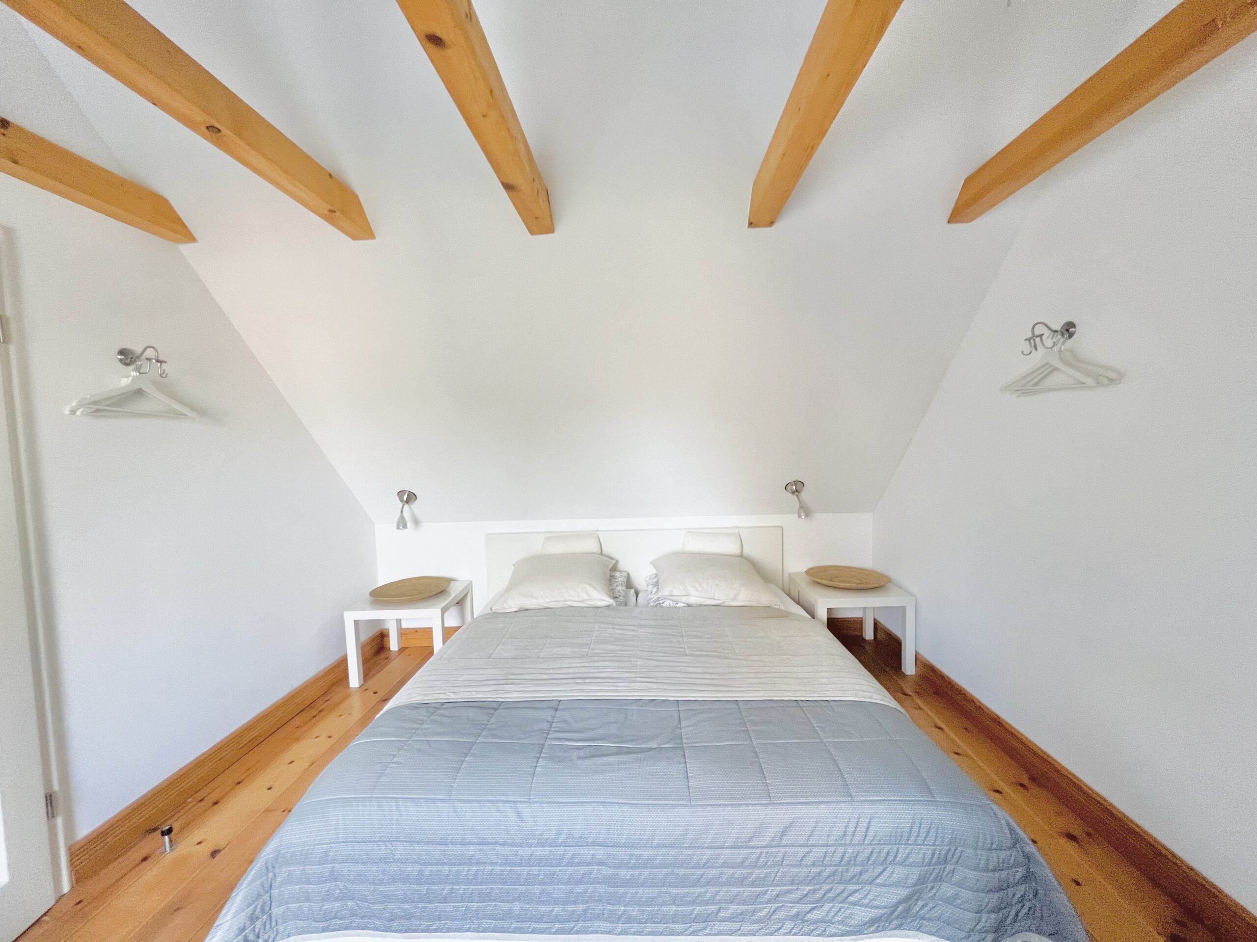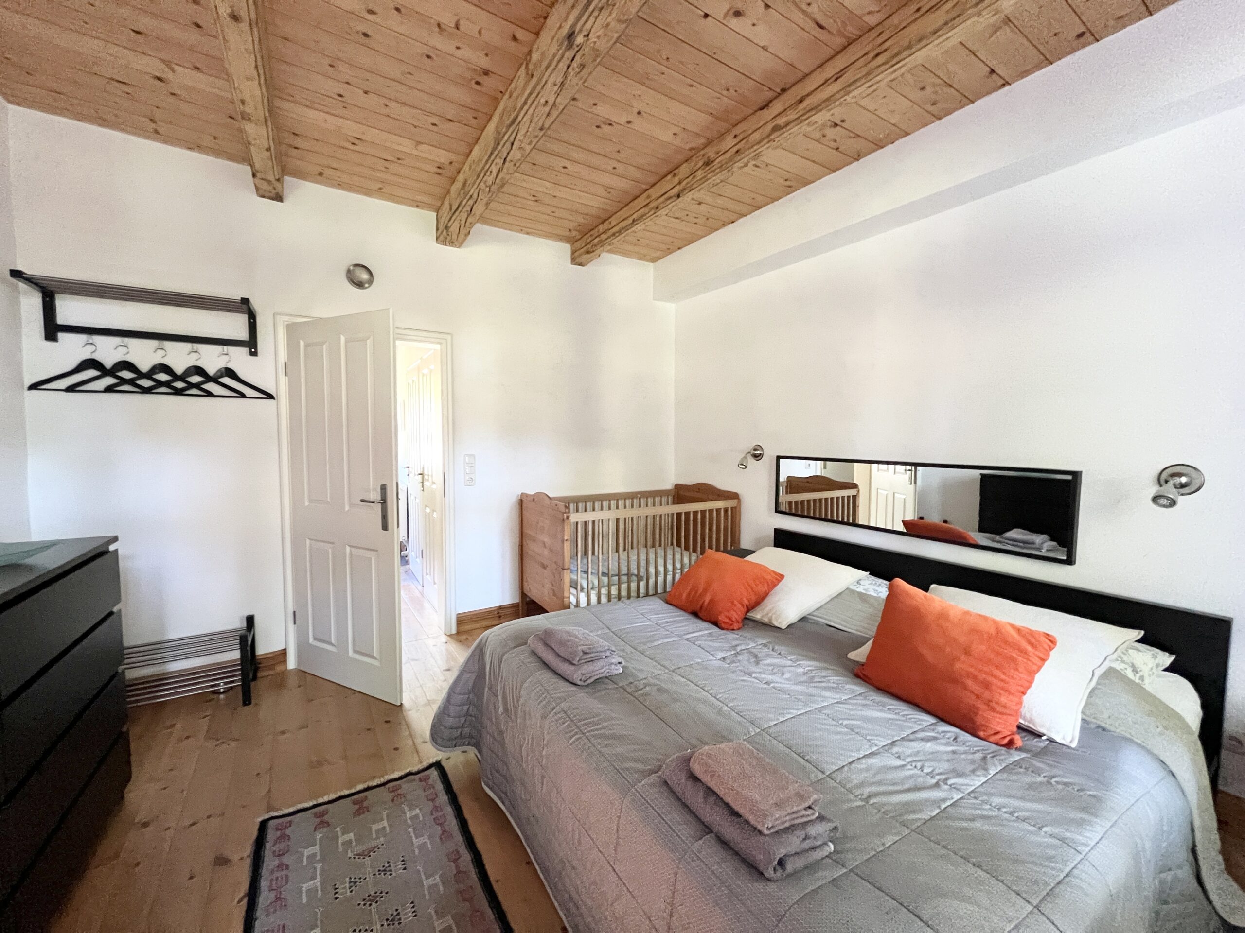 Im oberen Stockwerk befinden sich zwei weitere Schlafzimmer. Das eine Schlafzimmer verfügt über ein Doppelbett (180x200cm) und ein Kinderbett. Im anderen Schlafzimmer befinden sich drei Enzelbetten (90x200cm). Zudem befindet sich im 1.OG ein Badezimmer mit Doppelwaschbecken und Badewanne.