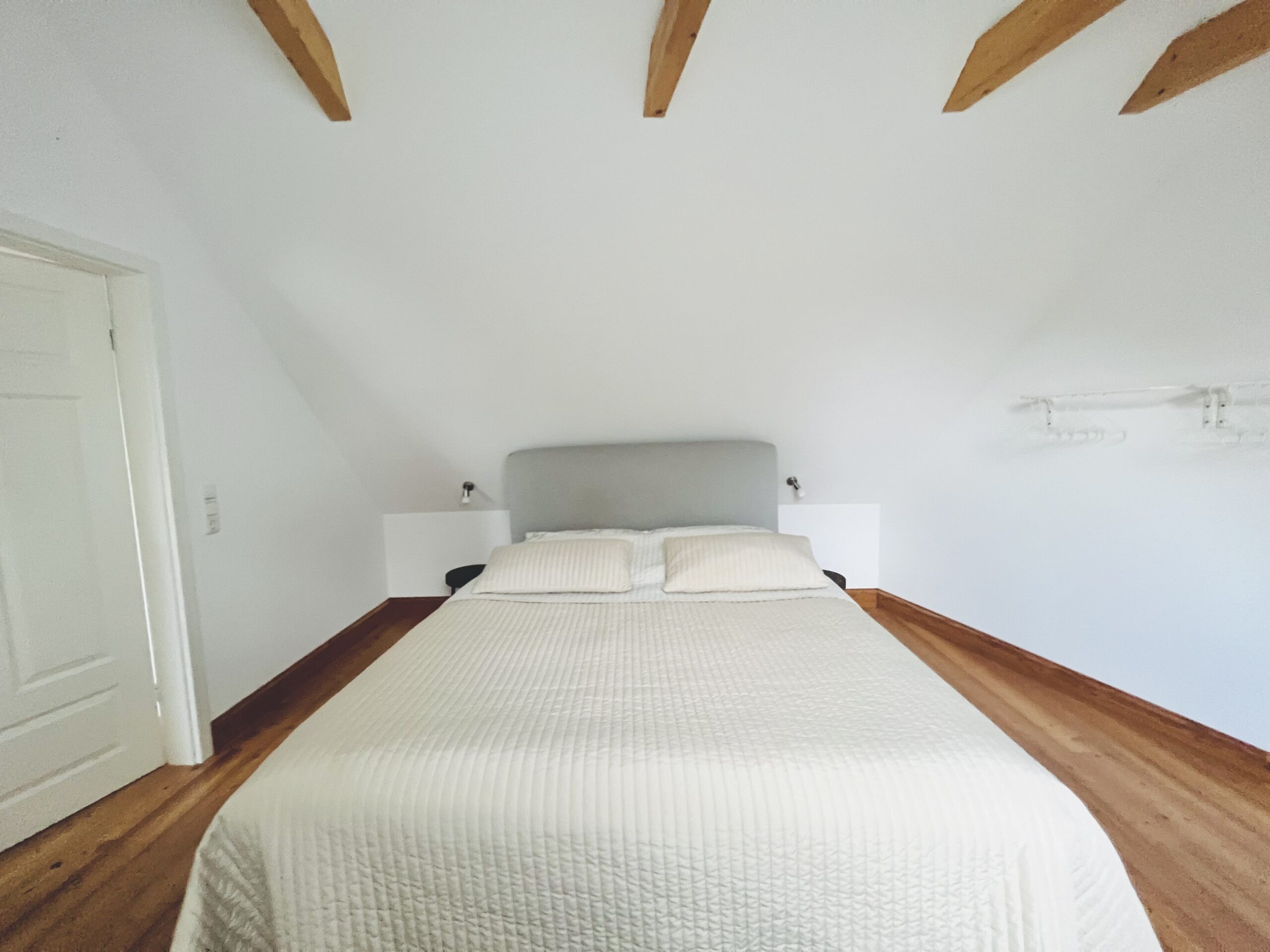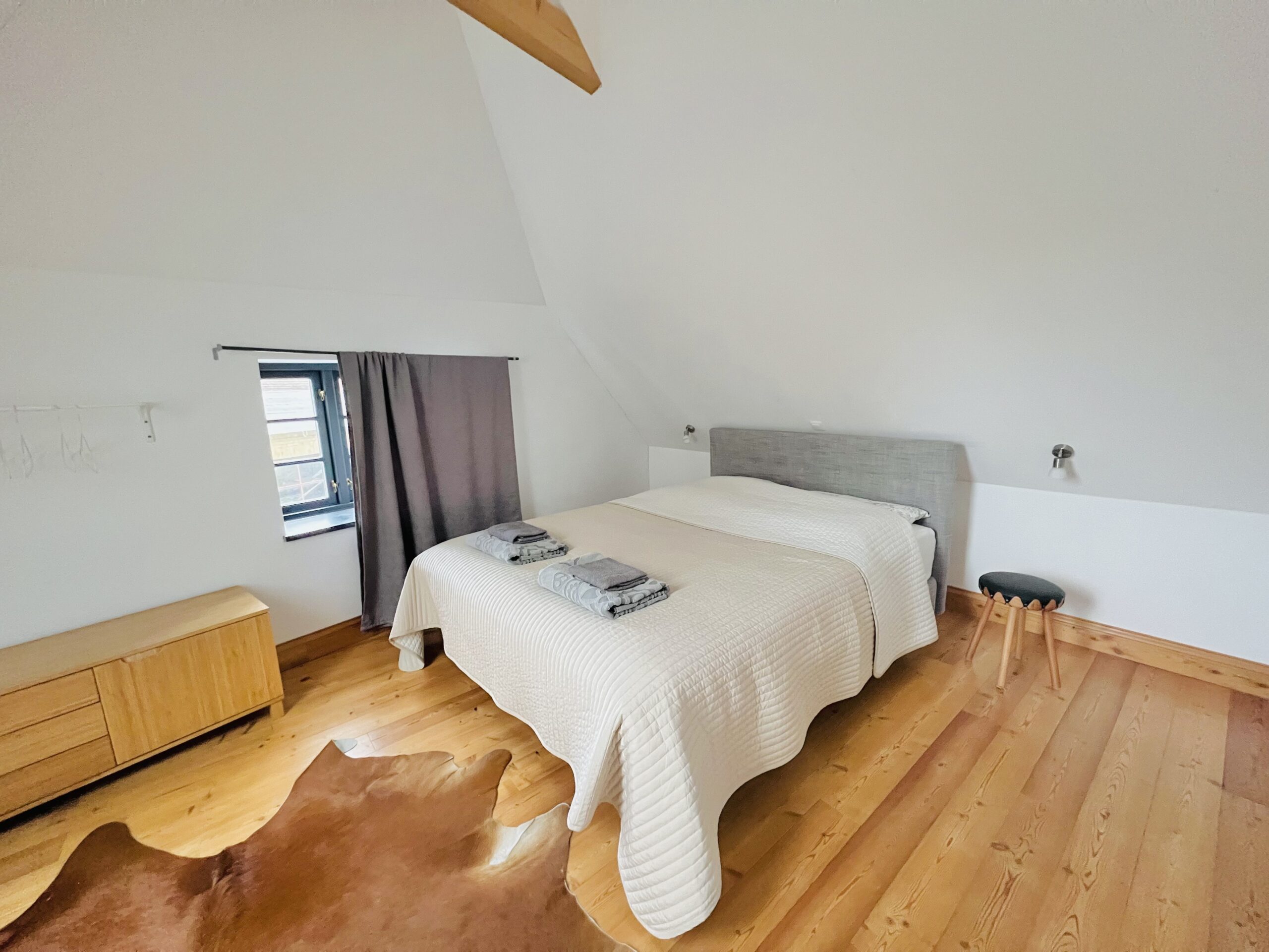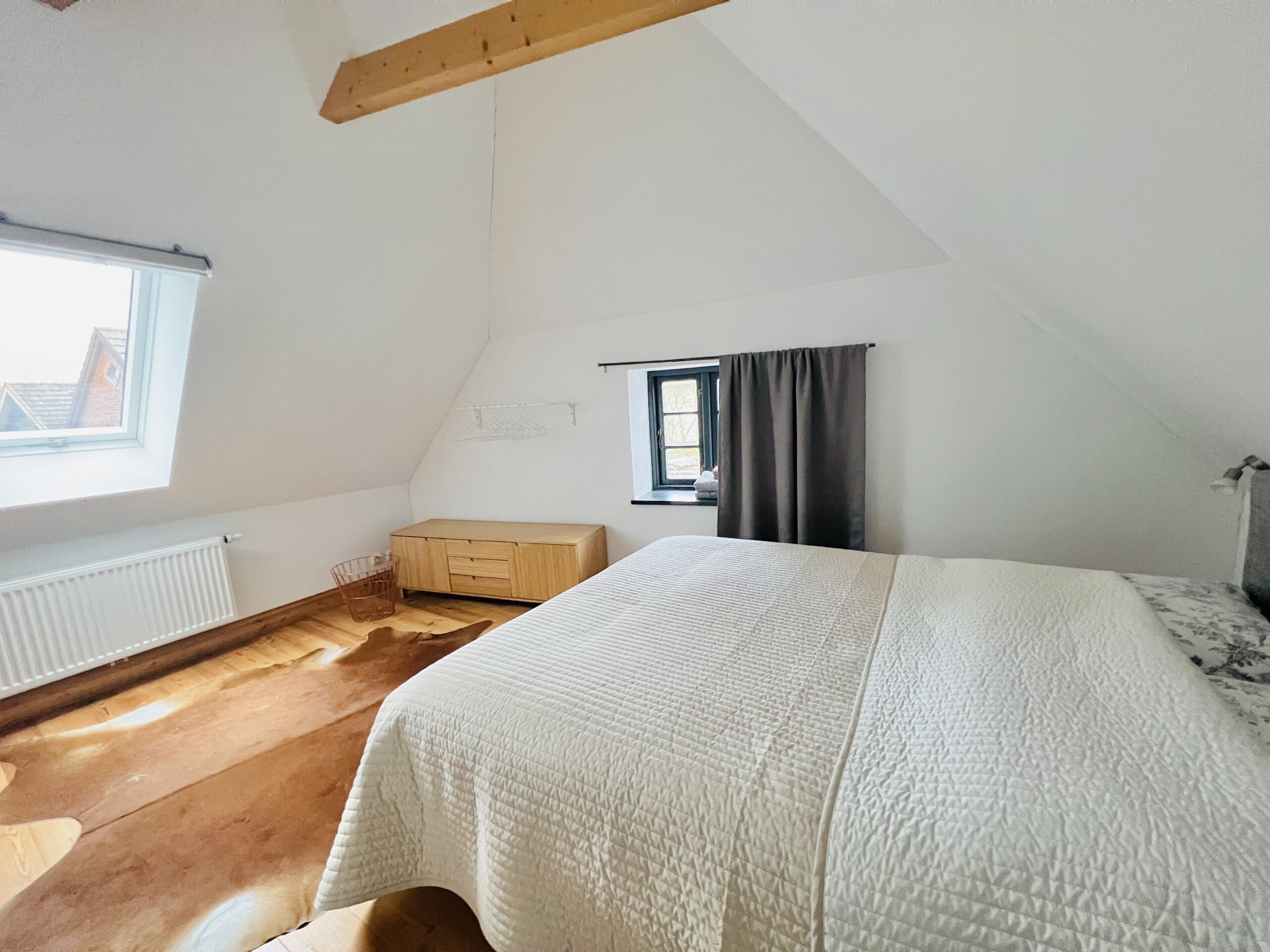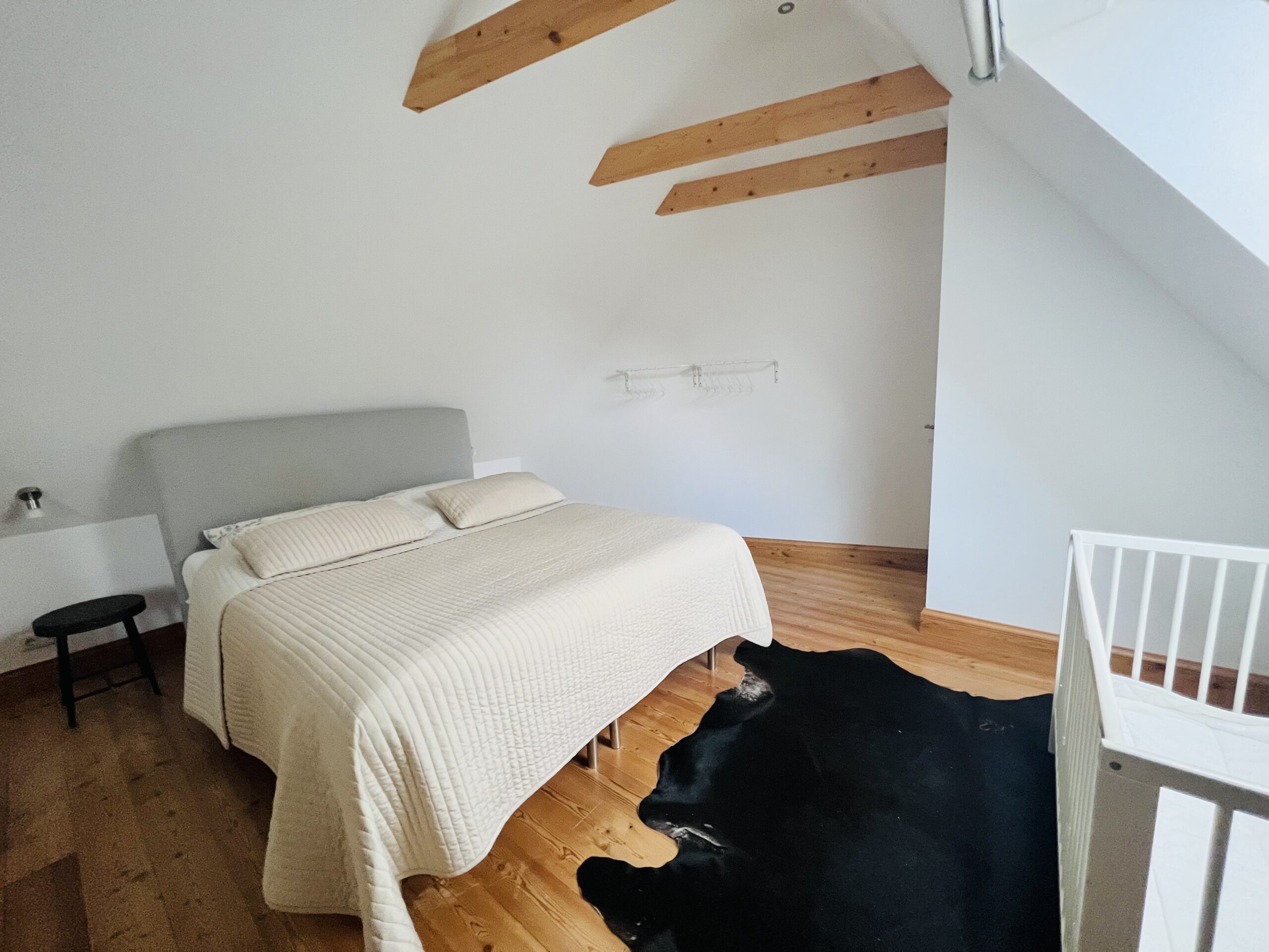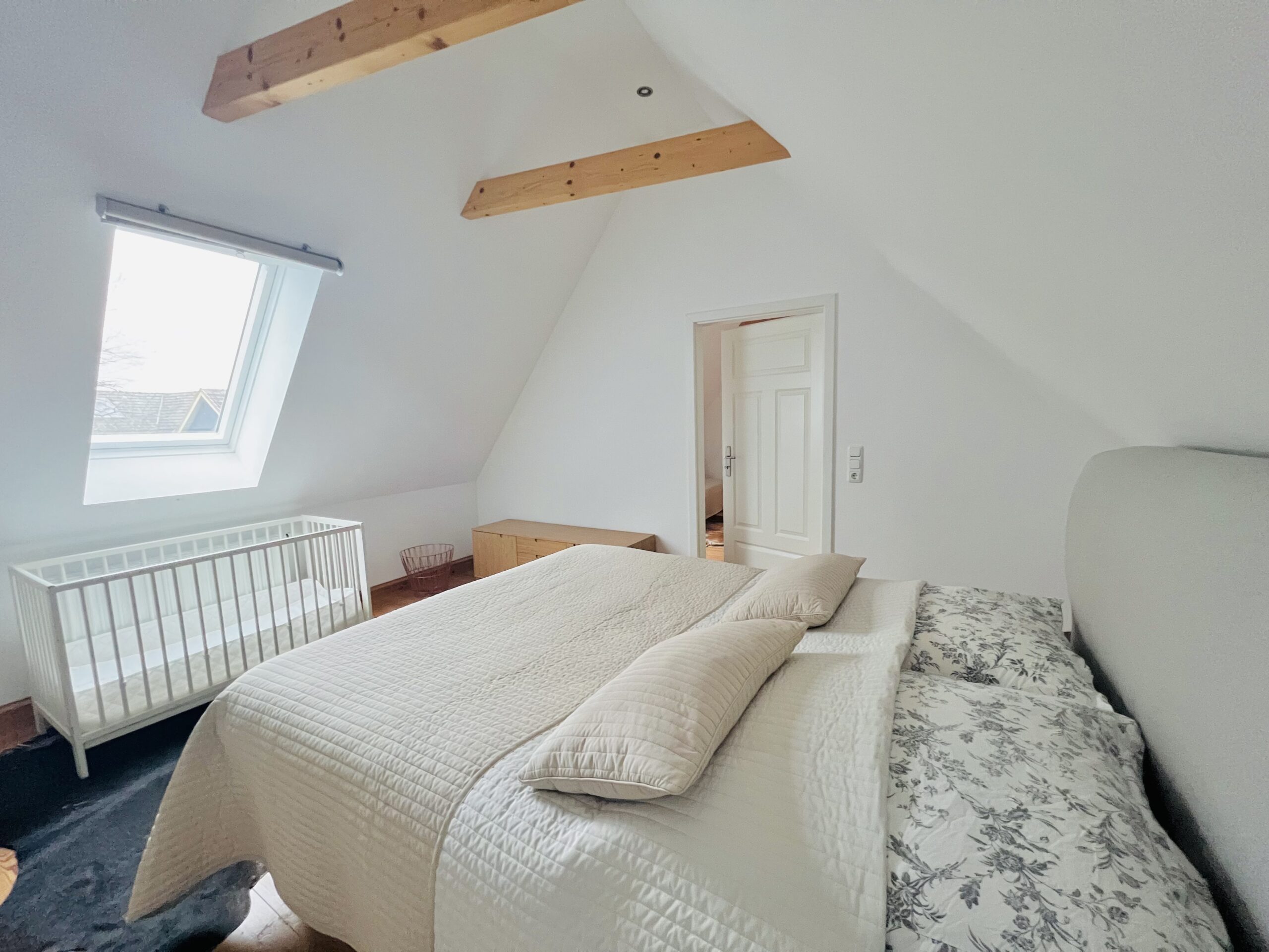 Im oberen Stockwerk befinden sich zwei weitere Schlafzimmer mit Doppelbetten (je 160x200cm Boxspringbetten) und ein kleines Kinderzimmerchen mit einem Kinderbett (ca. 80x180cm).